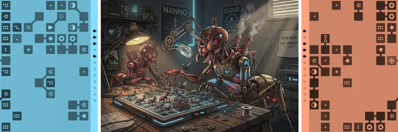 My original idea was to lay out the Antoids in a tightly packed initial array, with only the central battlefield as a buffer, like in chess. Out of fear it might overwhelm the observer, I let myself be inspired by Age of Empires and let the Queen (“her royal Town Center?”) start out with morsels of food to spawn all her units from scratch. In a moment of cunning, I also ruled that a Queen can only spawn a particular type if she has all lower-tier types on the field. This requires the Antoids to flee and heal more often, as the Queen would otherwise always be occupied with respawning cannon fodder. No need to mention that the costs increase progressively with each type.